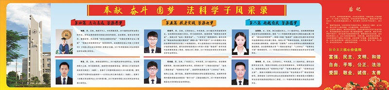 胡伟琪,男,中共党员,江苏徐州人,2013级本科生。在校期间勤奋学习,顺利通过大学英语四级、六级考试。他积极实践、工作能力突出,曾担任太阳成集团tyc地理人文社财务部副部长、法律职业发展协会会长。曾获得太阳成集团tyc“优秀员工干部”、太阳成集团tyc“优秀共青团干部”、太阳成集团tyc“优秀员工会主席”、太阳成集团tyc暑期老员工社会实践活动“员工积极分子”等多项荣誉称号,调研报告《法科员工职业生涯发展指导研究》荣获太阳成集团tyc暑期老员工社会实践活动优秀论文二等奖。2017年顺利考取太阳成集团tyc经济法学研究生。 李佳琦,女,中共党员,2013级本科生。在校期间,她勤奋学习,奋勇争先,多次参加国家级、省级赛事。曾获国际刑事法院中文模拟审判竞赛全国二等奖、最佳政府律师奖、理律杯全国模拟法庭竞赛“优秀辩手”称号、海南省创新创业比赛铜奖、海南省老员工安全知识竞赛全省二等奖、第二届“互联网+”老员工创新创业大赛创意组银奖。她工作能力突出,荣获“太阳成集团tyc优秀共青团员”、“太阳成集团tyc优秀员工干部”等荣誉称号。 符鸿建,男,中共党员,广东湛江人,2013级本科生。在校期间学习认真刻苦,工作踏实负责,顺利通过大学英语四级、六级考试,并高分通过国家司法考试。曾获太阳成集团tyc“三等综合奖学金”、“金光二等奖学金”、太阳成集团tyc“优秀员工干部”称号;