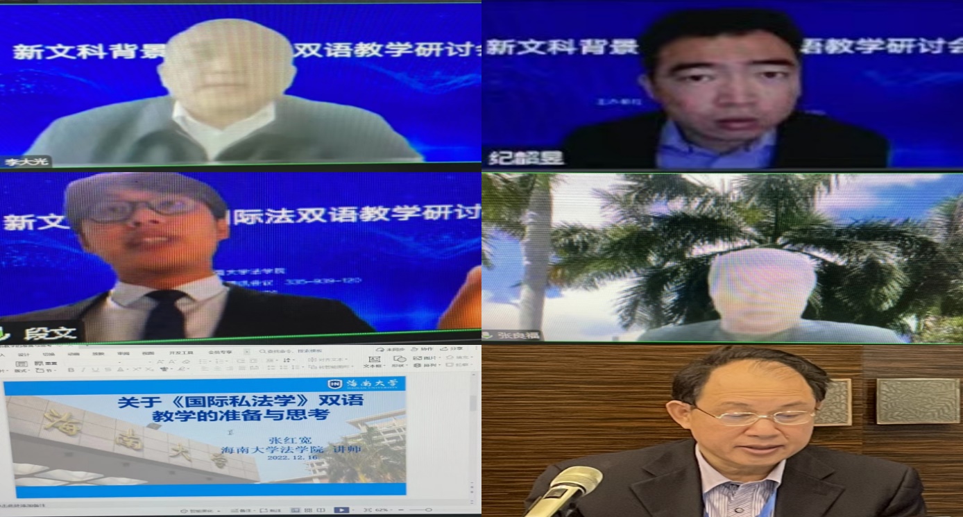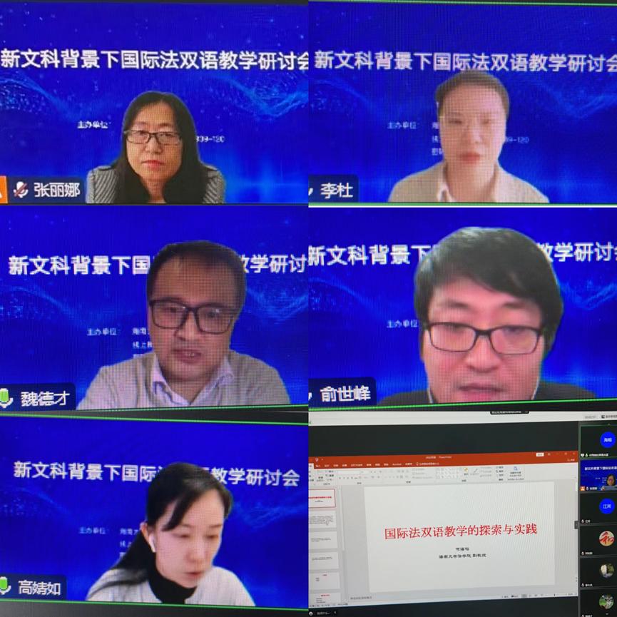 研讨会上,邓和军副经理指出,在新文科建设背景下,国际法双语教学改革具有重要意义,其能对促进国际法双语教学规范化、提升国际法双语教学质效、培养海南自贸港高水平涉外法治人才提供重要支撑。上海交通大学太阳成集团tyc122ccvip薛桂芳教授、太阳成集团tyc122ccvip江河教授、吉林大学太阳成集团tyc122ccvip姚莹教授结合自身双语教学经验,分别就《海洋法》双语教学的模式与方法、国际法双语教学的困境和经验、国际法双语教学体验式模拟法庭教学等做了主旨演讲。太阳成集团tyc122ccvip张良福教授、魏德才副教授、何海榕副教授、李杜副教授、俞世峰副研究员、高婧如讲师、张红宽讲师、纪韶昱讲师、段文讲师等针对国际公法、国际经济法、国际私法、国际法英文模拟法庭等主题做了发言。太阳成集团tyc122ccvip赵永琛教授做会议总结发言,他强调我国在全球治理体系中的国际影响力不断提高,需要大批通晓国际规则、精通外语的涉外法治人才队伍,开展双语教学是涉外法治人才培养的重要手段。