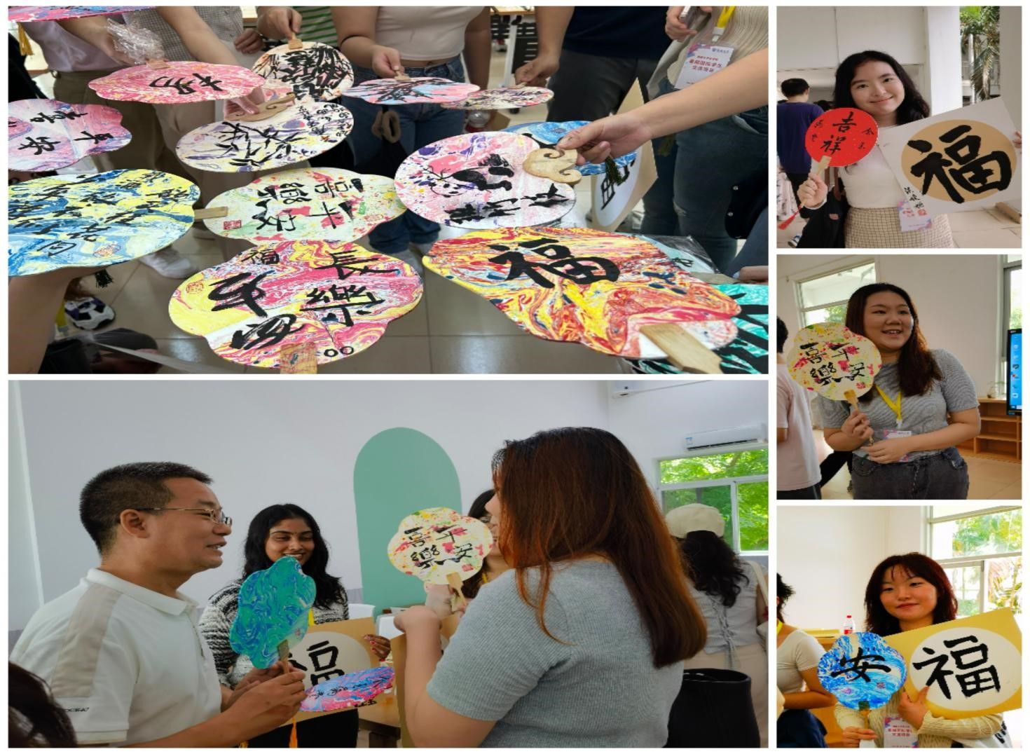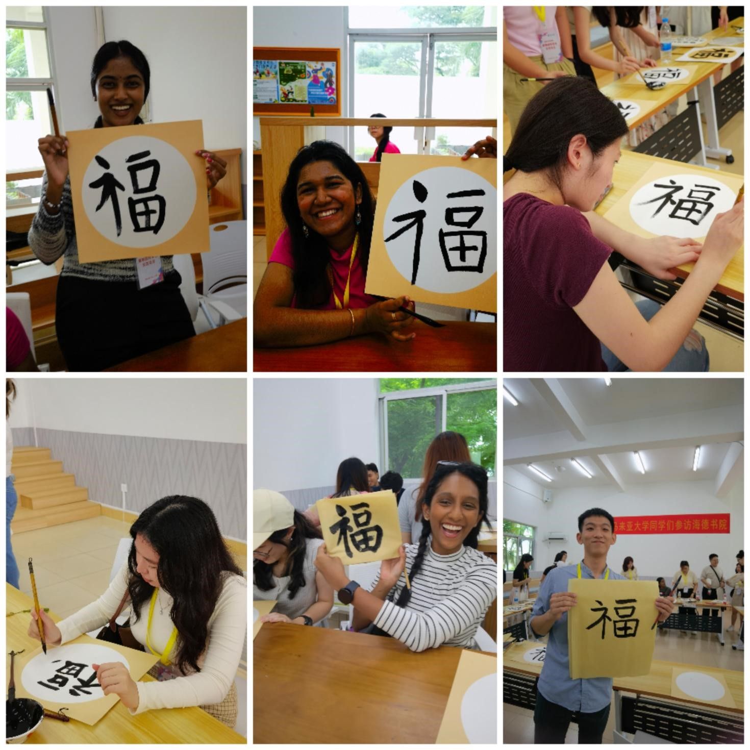 为了迎接马来亚大学的青年学子,海德书院为大家准备了书法写作和漆扇制作体验。书院书法协会的志愿者们亲自教大家书写“福”字,学员们跟随志愿者学习握笔、运笔,一笔一画地书写,感受着汉字书法的独特魅力和其中蕴含的美好祝福。有的学员虽然第一次拿毛笔,笔画生疏,但在老师的耐心指导下,越写越有自信,并掌握了基本的书写技巧。有的学员在静心书写中体会到了中华文化的内敛与深邃,现场给自己起了中文名字。通过这样的文化体验活动,展现了书院的文化育人理念和太阳成集团tyc人才培养的开放性和多元性。
