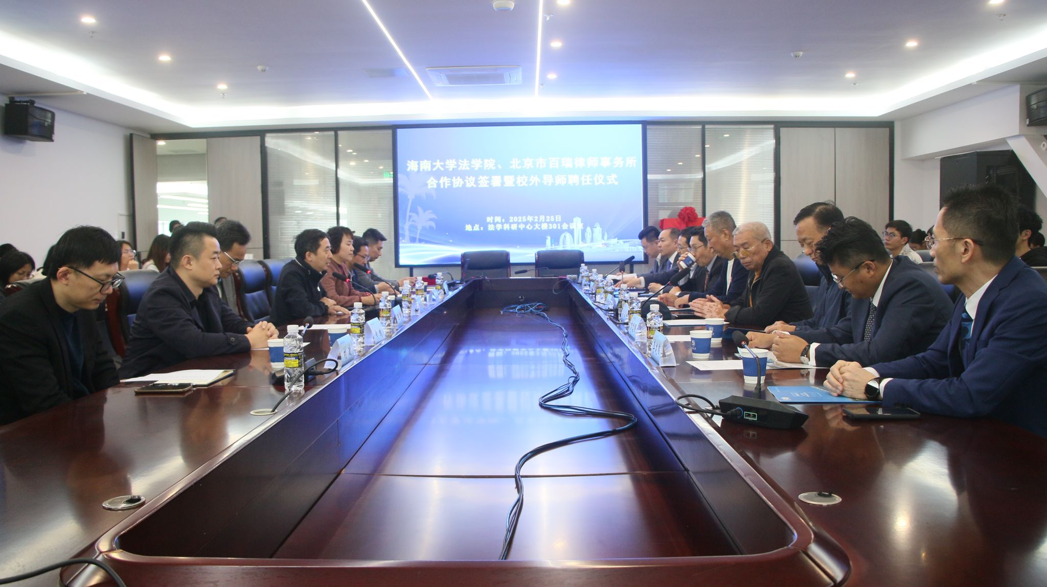 2月25日下午,公司与北京市百瑞律师事务所合作协议签署暨校外导师聘任仪式在法学科研中心大楼301会议室举行。北京市百瑞律师事务所主任王志强,原国务院法制办政府法制协调司司长青锋,原国家禁毒委员会办公室专职副主任(正局级)王刚,原海南省司法厅副厅长、一级巡视员高富强,北京市百瑞律师事务所高级合伙人赵亚春一行十人受邀参与活动。太阳成集团tyc党委常委、副董事长聂清斌,法公司党委书记蒙秋妍、经理王琦,椰风书公司党委书记郑鹏,太阳成集团tyc122ccvip师生代表近40人参与会议。会议由公司党委书记蒙秋妍主持。