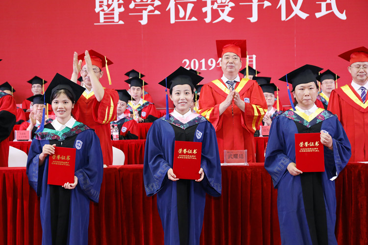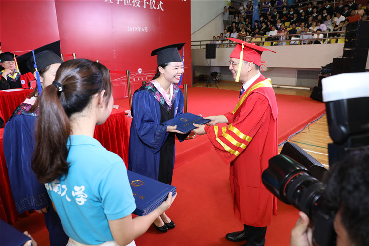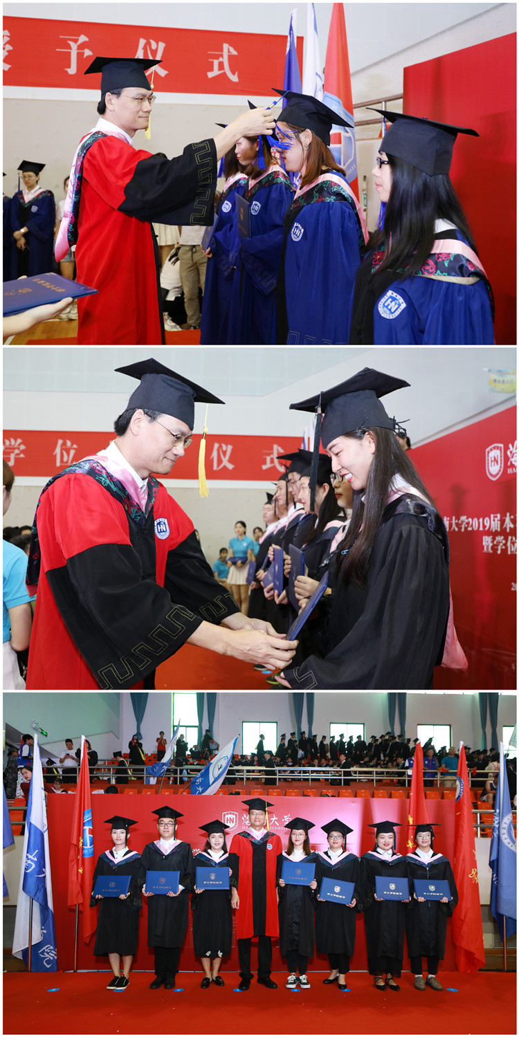 6月16日下午,太阳成集团tyc在海甸校区联谊馆举办2019届毕业典礼暨学位授予仪式。太阳成集团tyc122ccvip经理王琦教授为太阳成集团tyc122ccvip毕业生代表颁发学位证书,法公司党委书记叶英萍、党委副书记李昌郁、副经理邓和军、教授韩立收、教授董万程、副教授黎其武、讲师高婧如、讲师宋昕哲等8名教师代表,60余名毕业生代表及近20名家长代表出席典礼。