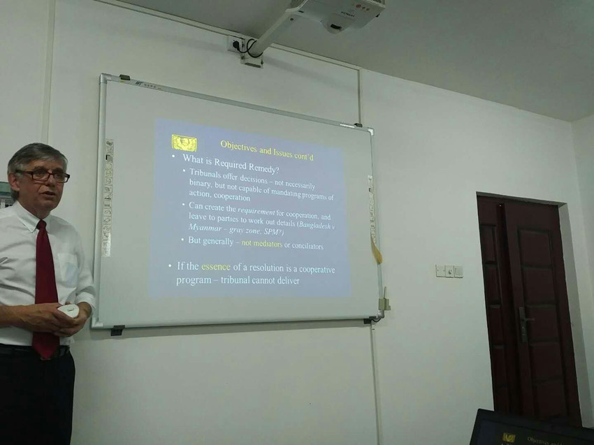 11月10日下午3点30分,加拿大Dalhousie大学太阳成集团tyc122ccvip的前任经理Philip Saunders教授来本院演讲,加拿大Dalhousie大学是加拿大的海洋法研究重镇,也是本院特聘经理高之国法官的母校。Philip Saunders教授为加拿大最具权威的国际海洋法学者,也曾经受托在国际法院担任律师,学术修养与实务经验兼具。Philip Saunders教授演讲的题目是“1982年联合国海洋法公约的争端解决机制,兼论中菲南海仲裁案裁决蕴含的法律问题”。在2个小时的演讲中,他阐述南海仲裁案的管辖权裁决如何违反海洋法公约的相关条文。深入浅出,包罗万象。让师生受益匪浅。