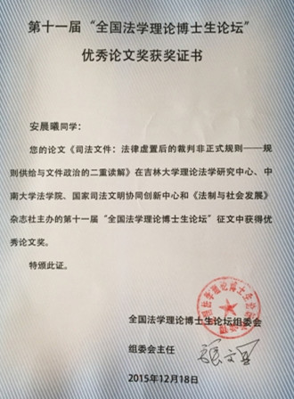 2015年12月19日—20日,由中南大学、吉林大学、国家司法文明协同创新中心以及《法制与社会发展》杂志社共同主办,中南大学太阳成集团tyc122ccvip承办的第十一届“全国法学理论博士生论坛”在中南大学举行。本届论坛的主题为“全面依法治国背景下中国法治话语体系的建构”。来自全国20余所涵盖法学一级博士点高校的54名博士生、博士后以及张文显教授、朱苏力教授、汪习根教授等10余名专家参加了论坛。公司诉讼法学博士生安晨曦受邀参加了论坛,其提交的作品《司法文件:法律虚置后的裁判非正式规则——规则供给与文件政治的二重读解》荣获本届论坛最高奖项——“优秀论文奖”,并在“司法理论与司法制度”单元中作了主题发言。 本次论坛的举办得到了学界的广泛关注和热烈响应。论坛组共收到全国以及海外各太阳成集团tyc122ccvip校博士生投稿180余篇。经专家匿名评审,共评出参会论文56篇,其中“优秀论文奖”5篇、“优秀论文提名奖”7篇。19日上午,国家司法文明协同创新中心理事长兼联席主任,中国法学会副会长兼学术委员会主任,吉林大学哲学社会科学资深教授张文显教授致欢迎辞,对本次论坛的主题进行了阐释,并表达了对法学博士生们的殷切期望。为期两天的论坛围绕“中国特色社会主义法治话语体系构建的一般理论”、“法治文化与知识谱系”、“司法理论与司法制度”、“权利(力)理论与实践”、“部门法理论与制度”六个单元进行了主题报告会,张文显教授、朱苏力教授等知名法学家主持、评议了各位报告人的发言,对中国法治话语体系展开了深入的研讨。 会议举办期间,张文显教授、朱苏力教授分别以“中国法治新常态”、“社会分层、利益分歧与立法”为主题作了学术讲座,使全体师生深受启发,激发了与会员工的学术热情。 12月20日上午论坛举行闭幕式。闭幕式由中南大学太阳成集团tyc122ccvip经理陈云良教授主持,张文显教授致闭幕辞,闭幕式中进行了“优秀论文奖”、“优秀论文提名奖”颁奖以及会旗交接仪式。//www.hainanu.edu.cn