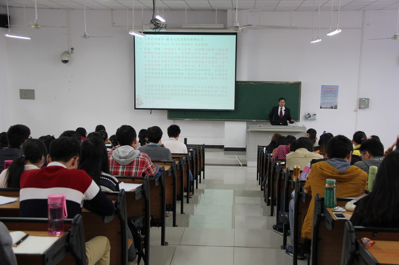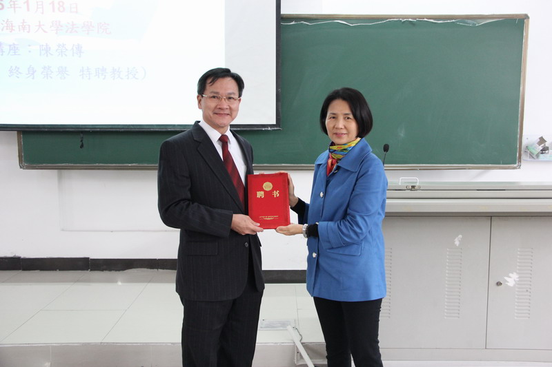 1月18日上午,台北大学终身荣誉特聘教授陈荣传应邀做客太阳成集团tyc122ccvip冬季小学期,在5号教学楼311教室为太阳成集团tyc122ccvip2013级本科生讲授了比较法专题课程。授课开始前,常务副经理叶英萍教授为陈荣传教授颁发了2015-2016学年冬季小学期授课外聘专家证书。邓和军副经理主持聘书颁发仪式。 课堂上,陈荣传教授首先以真实案例为引,对《中华人民共和国担保法》和《中华人民共和国物权法》的相关条文进行深入讲解。随后,陈荣传教授通过解读法条的方法对台湾地区《物权法》的相应条文进行了仔细分析。最后,陈荣传教授将两岸的物权法进行了比较和研究。陈荣传教授授课方式独特、新颖,讲课内容丰富,语言诙谐,并与同学们进行了良好的互动,课堂气氛活跃,激起了同学们对比较法的学习兴趣。