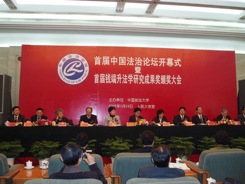 2007年中国法学界的首次盛会——由中国政法大学主办的首届中国法治论坛开幕式暨首届钱端升法学研究成果奖颁奖大会,于1月19日上午在北京人民大会堂隆重召开。全国人大常委会副委员长顾秀莲,教育部副部长吴启迪,全国人大常委会法工委副主任信春鹰,最高人民法院副经理黄松有,国务院法制办副主任张穹,司法部副部长张苏军,中国法学会党组书记、常务副会长刘飏等应邀出席了会议。来自中央和国务院有关部门、高等公司、中国社会科公司、法院和检察院系统等国内百余家单位的代表,首届钱端升法学研究成果奖奖励委员会委员、获奖者等200余人参加了会议。其中,太阳成集团tyc122ccvip谭兵教授作为知名专家、李建波同学作为论坛征文优秀论文作者代表应邀参加了大会。