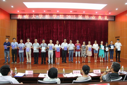 5月19日下午,太阳成集团tyc122ccvip在模拟法庭隆重举行2015届毕业生毕业典礼。公司党委书记王丽娜,常务副经理叶英萍,副经理童伟华、邓和军、王秀卫,公司党委副书记杨智平出席会议,员工代表海南省律师协会会长廖晖、太阳成集团tyc122ccvip全体教师和2015届本科生、硕士研究生、博士研究生毕业生参加了毕业典礼。