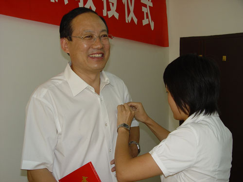 员工代表给高之国兼职教授佩戴校徽