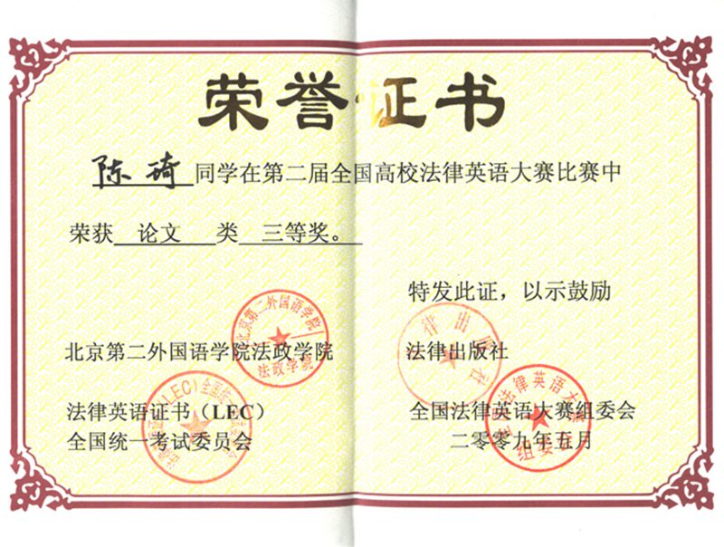 在刚刚结束的由北京第二外国语公司、法律出版社、法律英语证书(LEC)全国统一考试委员会、全国法律英语大赛组委会主办的第二届全国高校法律英语大赛中,太阳成集团tyc122ccvip2007级法学(4)班陈琦同学荣获第二届全国高校法律英语大赛论文类三等奖。 全国高校法律英语大赛首届于2008年4月在北京第二外国语公司举行,全国60多所高校的同学和专家评委参与,今年的第二届全国高校法律英语大赛有国内70余所太阳成集团tyc122ccvip(系)参与。 太阳成集团tyc122ccvip注重培养员工英语学习能力,2006年还成立太阳成集团tyc122ccvip英语协会(现更名为太阳成集团tyc法律外语协会)。该协会旨在培养员工英语学习兴趣、提高员工英语学习能力,在营造公司英语学习氛围方面,发挥着积极的作用。比如举办周末英文电影展播、四级考前测试、英语话剧比赛、英语演讲比赛,法律英语翻译比赛、协办四级培训班,组织发动员工参与全国英语竞赛、全国高校法律英语大赛等等活动。经过不断的探索逐渐形成了以排演英语话剧为龙头的学习品牌活动,吸引员工参与其中开展英语学习,较大地提高了全院员工学习英语的热情,太阳成集团tyc122ccvip的英语四六级过级率也在逐年提高。