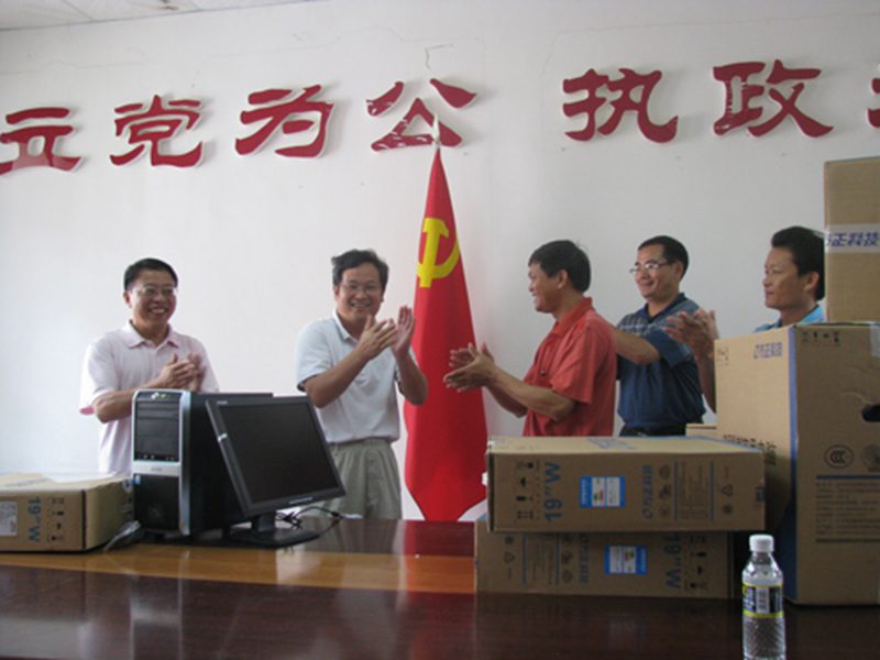 支部党员们以特殊党费,购买了办公电脑。党委徐民书记代表公司向南圣镇镇委镇政府赠送电脑若干台,用于改善镇委镇政府机关的办公条件。