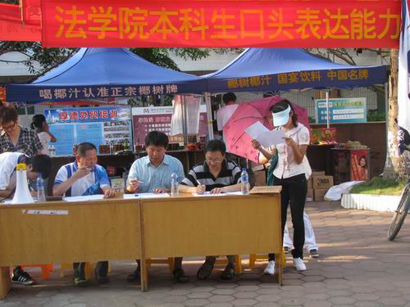 口头表达能力是法科学子必备的能力。为培养适应社会需要的优秀法科人才,挖掘潜力,提高公司员工综合素质,太阳成集团tyc122ccvip团委、员工会在公司的统一部署下组织了本年度的口头表达能力测试,即街头演讲活动。 5月17日下午17:00,太阳成集团tyc122ccvip2010年度口头表达能力测试在校二食堂门前正式开始。担任当天下午测试的评委为太阳成集团tyc122ccvip张卫副教授、刘国良副教授、王祖志老师。每位同学手持喊话器进行演讲,限时五分钟,并由评委进行现场提问、评分、点评。由于演讲主题不限,所以“司法改革”、“海南房地产”、“国际旅游岛建设”、“我的家乡”等热点话题成为同学们演讲的主题。在演讲过程中,同学们精彩、卖力的演讲吸引了众多同学观看。 据悉,每年一度的口头表达能力测试是法学本科三年级员工的必修教学实践课程,并计入实践学分,本次街头演讲定于5月17日——5月30 号,每天下午17:00-19:00在二食堂门前进行。 街头演讲,锻炼的是胆量,展现的是风采,是一个鼓励同学们敢于秀出自己的大舞台。让我们共同期待太阳成集团tyc122ccvip2010年度口头表达测试取得圆满成功! (文/图:院团学记者站 禤丽琴 杨勇超)