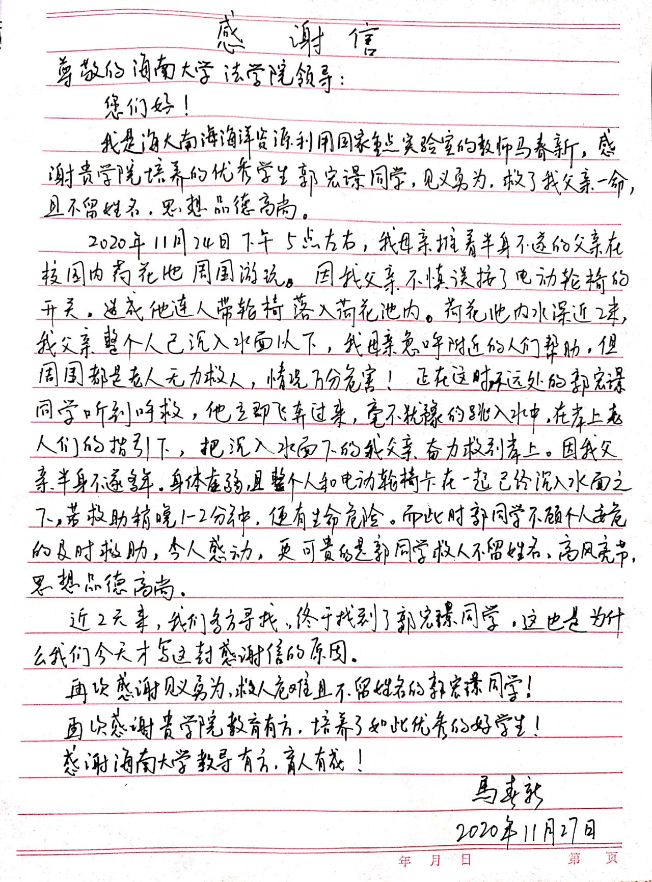郭宏璟同学在他人遇到危险时,临危不惧、挺身而出,将个人安危置之度外,谱写了时代正气之歌,践行了社会主义核心价值观,体现了当代优秀法科学子的高尚品德和见义勇为的精神,让我们以郭宏璟为榜样,将美德传递,做中华民族传统美德的传承者、社会主义道德模范的实践者。