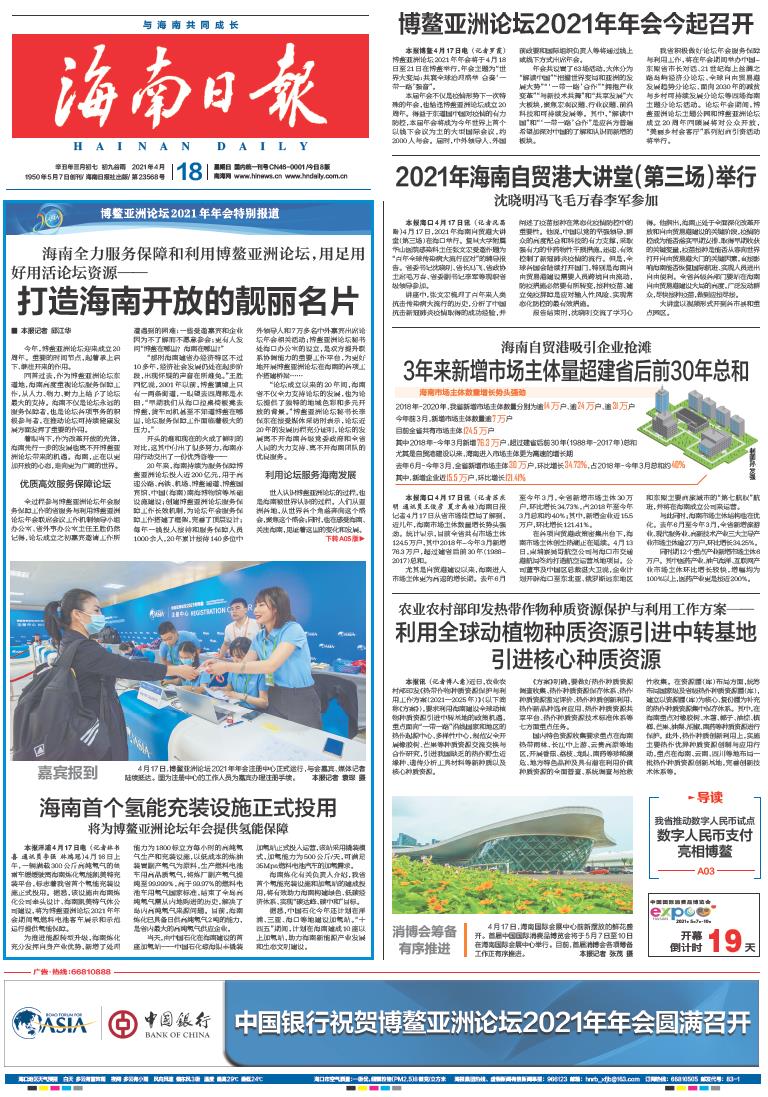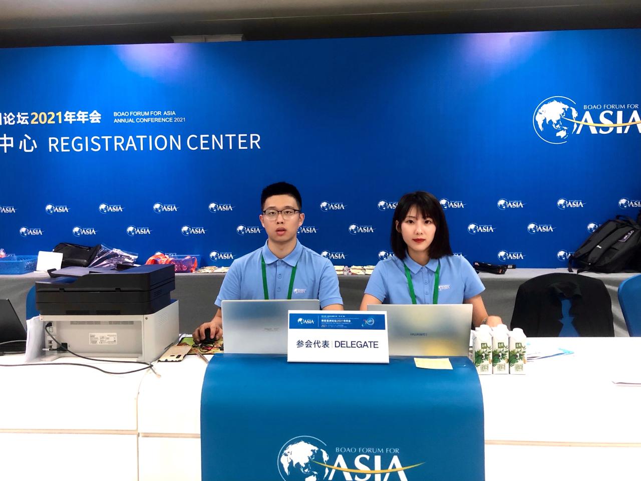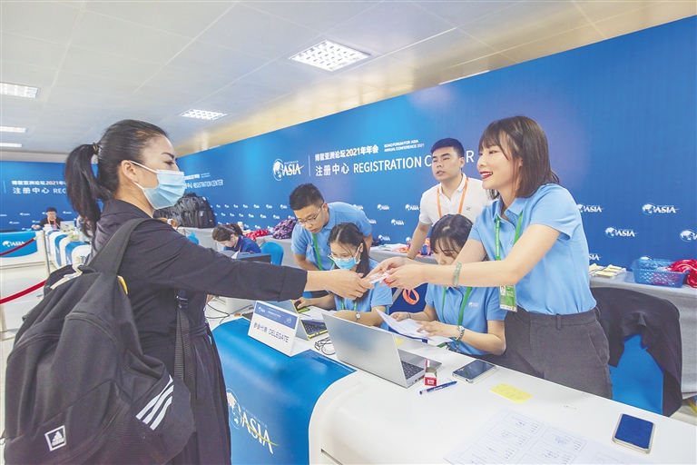 2021年4月18日,在博鳌亚洲论坛培兰注册中心,太阳成集团tyc122ccvip研究生谷雨、王艺晗等同学在现场为前来的嘉宾提供注册登记服务。海南日报的记者对这一场景进行拍摄,并将他们的照片刊登在当日的头版头条位置。