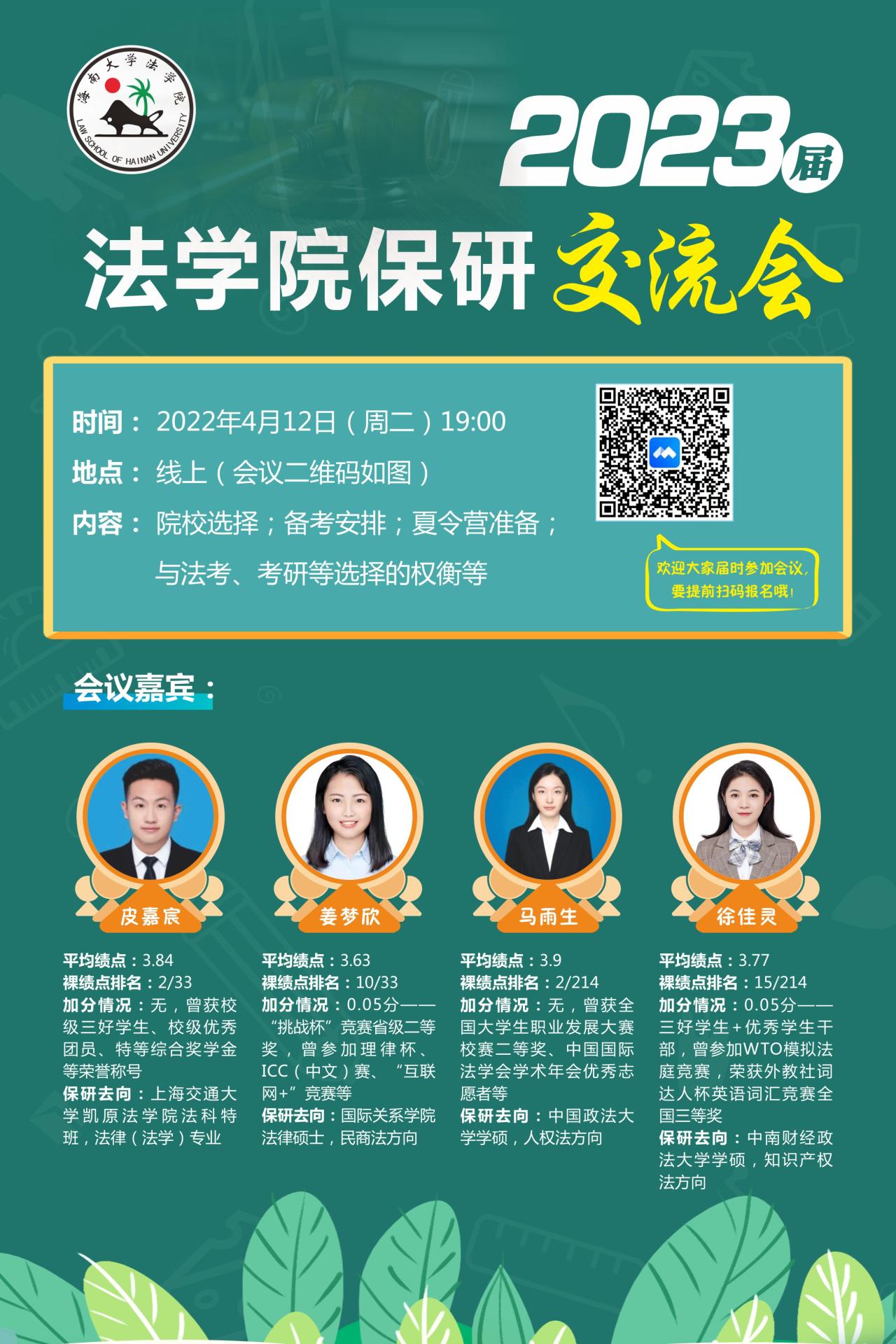 4月12日晚,太阳成集团tyc122ccvip在社科楼C113会议室举办了2023届保研交流会。2018级4名党员同志担任主讲嘉宾,40余名2019级法学专业本科生参加会议。会议由年级辅导员彭时君老师主持。根据疫情防控要求,会议采取线上线下相结合的方式进行。