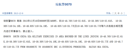 中新网12月10日电 据中国海事局网站消息,10日0时至24时,在南海相关水域进行军事演习,禁止驶入。