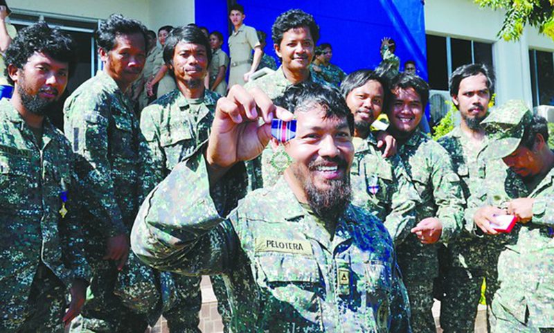 3月31日,从仁爱礁“换防”下来的菲士兵炫耀获得的奖章